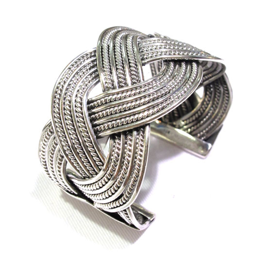 The silver bangle makes a fashion statement with three crisscross bands. The wide bands are delicately crafted with details for an elaborate touch. Its open design also makes it easy to wear and take off.