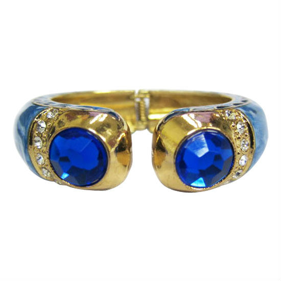 Accentuate your daily look with this fashion stone bangle. Showcasing detailed craftsmanship and a tasteful design, this jewelry cuff bangle flaunts turquoise and gold tones for a demure touch. Embellished with 2 round faceted blue stones and shimmering diamante, this unclosed bangle makes an ideal gift for those who are trendsetting and confident to show off a unique style.