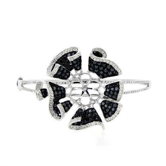 This bangle mounting is specially designed for setting a pearl. It is meticulously paved with sparkling black and diamonds for a deluxe and eye-catching look. The flower shaped mounting is a great choice for finishing your elegant jewelry design.