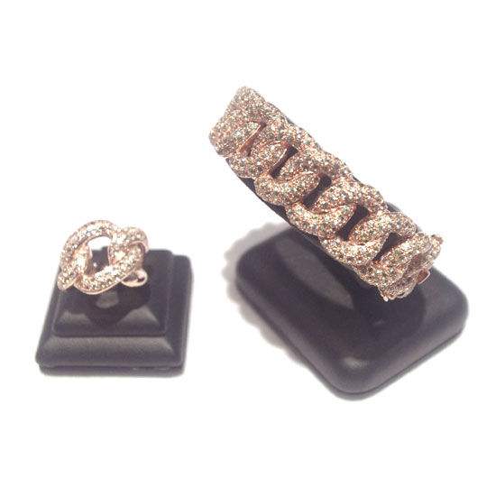 This is a bangle and ring set that is made of rose gold and shimmers with a high-gloss finish. The allover green sapphire gemstones are well paved on the surface. This jewelry set is an ideal addition to complete your fashion collection.