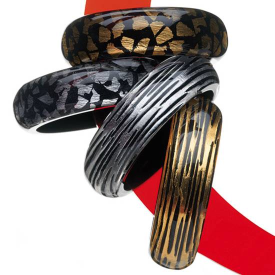 These are bangles made of resin. They are in different patterns and various colors are available for options. The bangles are the ideal accessories for women to easily match with casual wear of jeans or skirts.