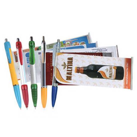 The banner pen is a great advertising premium item. There is a metal strip at the side of the pen, a scroll is revealed when the strip is pulled. The scroll is highly customizable that makes the pen a great advertising premium. The scroll retracts automatically when released.