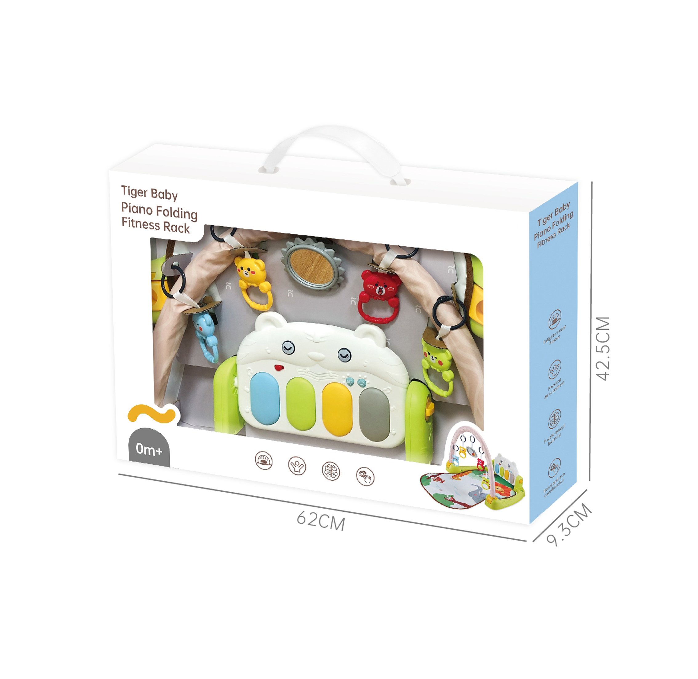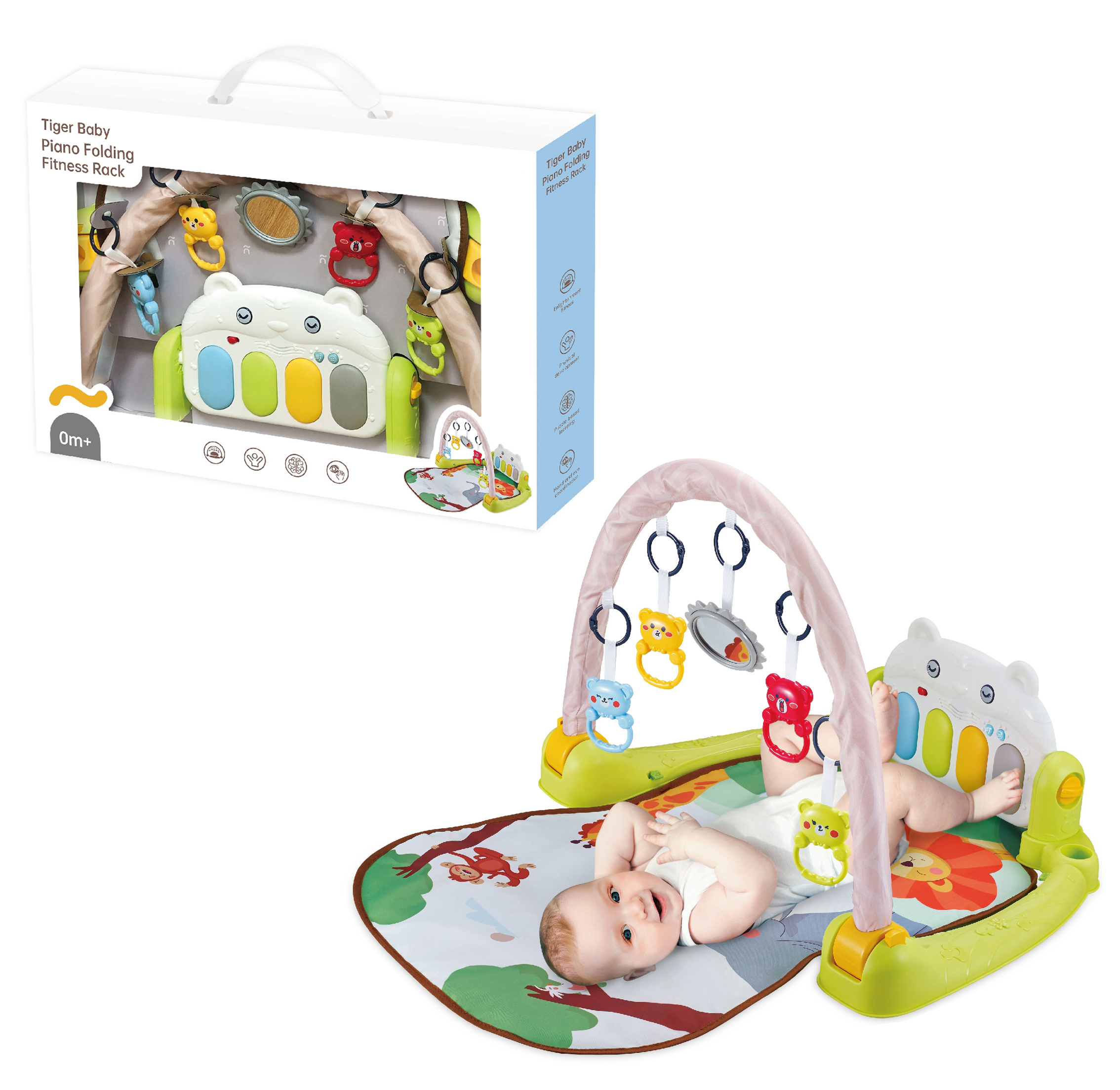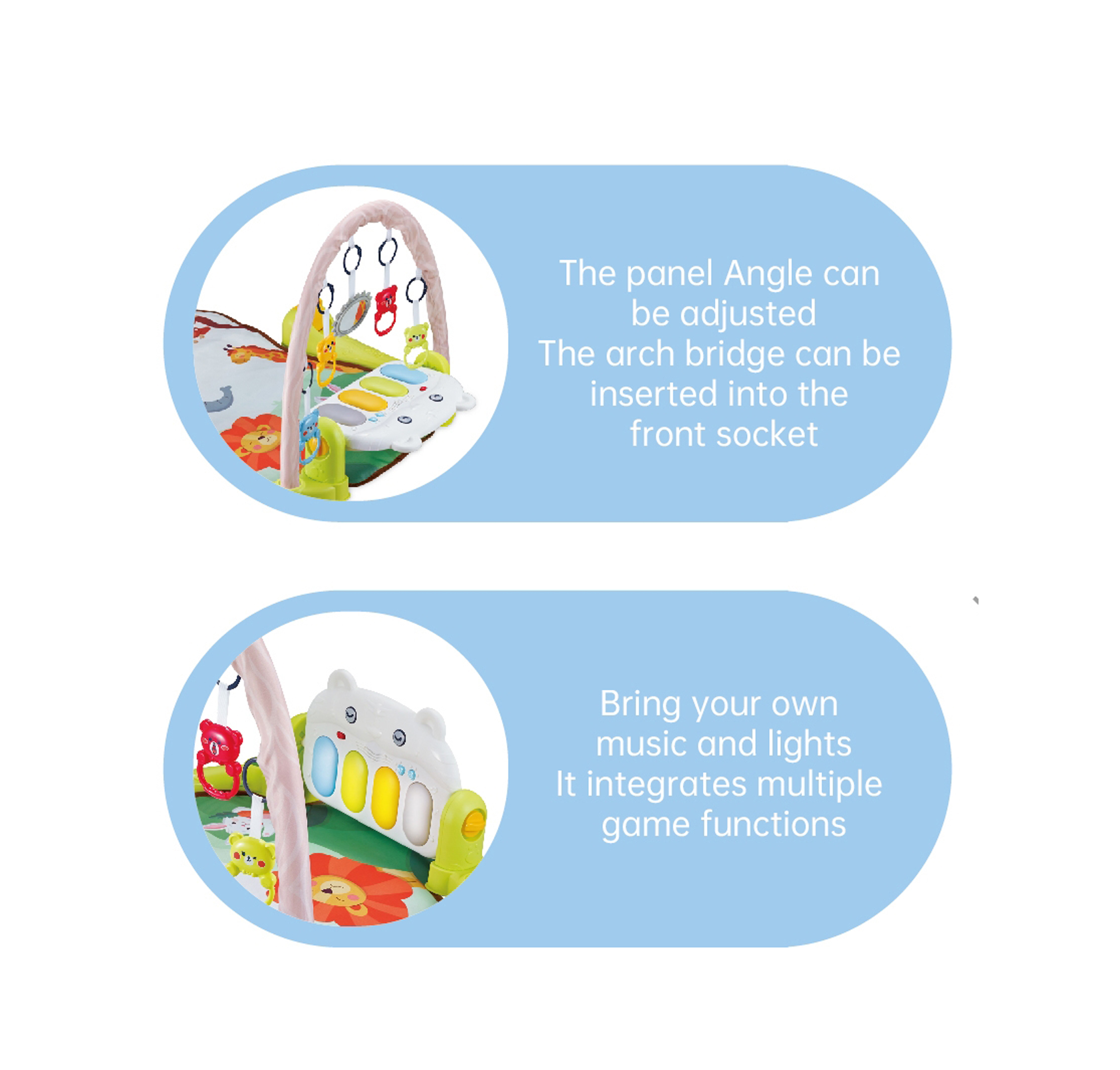 1. Multifunctional switching baby fitness frame, allowing baby to kick and play, and guiding baby to lie down, sit and stretch. 2. The product adopts the design of piano keys. Striking the piano keys, bringing music, lighting, storytelling, etc. play the