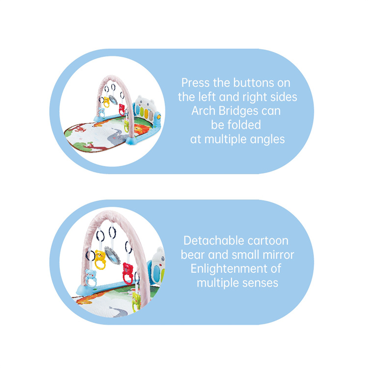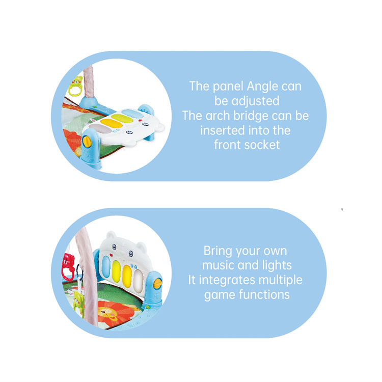1. Multifunctional switching baby fitness frame, allowing baby to kick and play, and guiding baby to lie down, sit and stretch. 2. The product adopts the design of piano keys. Striking the piano keys, bringing music, lighting, storytelling, etc. play the