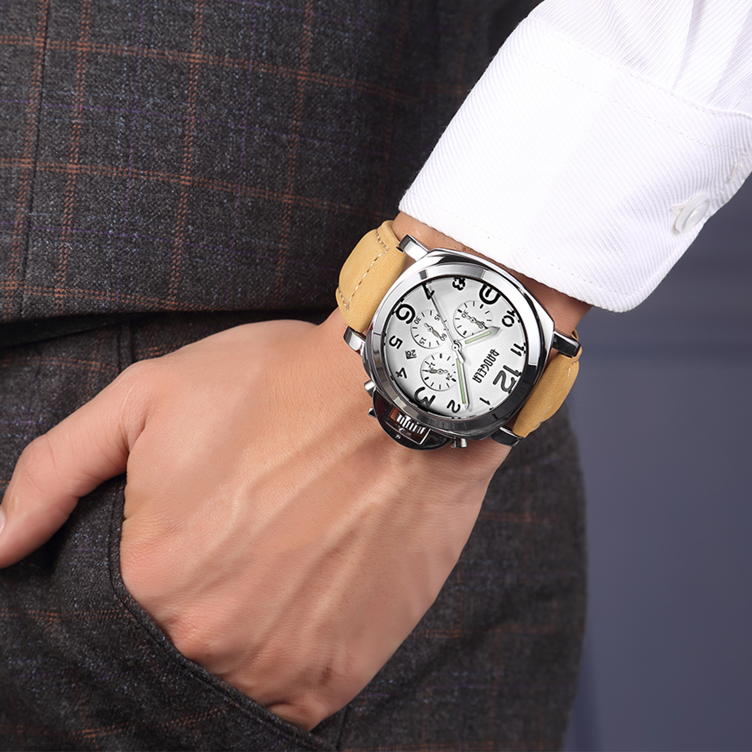 Baogela Mens Watches Brown Leather Strap Fashion Chronograph Reloj Hombre Christmas Gift Quartz Watch