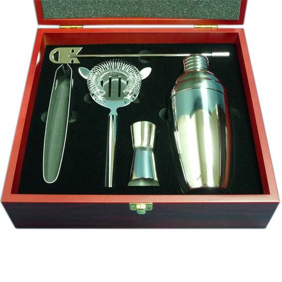 This is a bar set with a durable storage box. The set is ideal for mixing cocktail at home. There are five metal made items in the set.