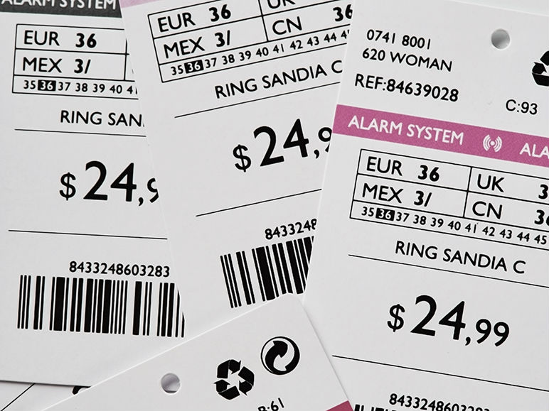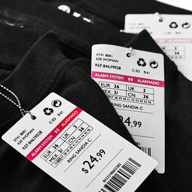 The displayed barcode tag has a barcode printed at the bottom and has a ball chain on top for attachment. It offers ample space for printed product information such as price, size, product number and more. This barcode tag is available in customized designs and is suitable for garment and accessories use.