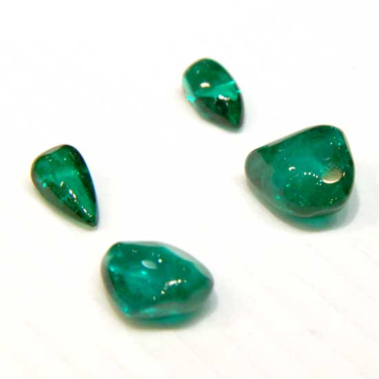 Featured are quality emeralds possessing a crystalline structure. The gems are in Baroque shape with a smooth surface. Brilliant craftsmanship equips these beautiful stones to suit high-end jewelry.