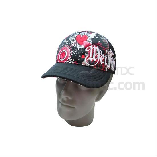 - Right: five-panel, foil print, studs and 3D embroidery.