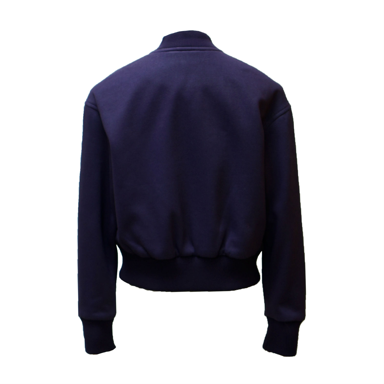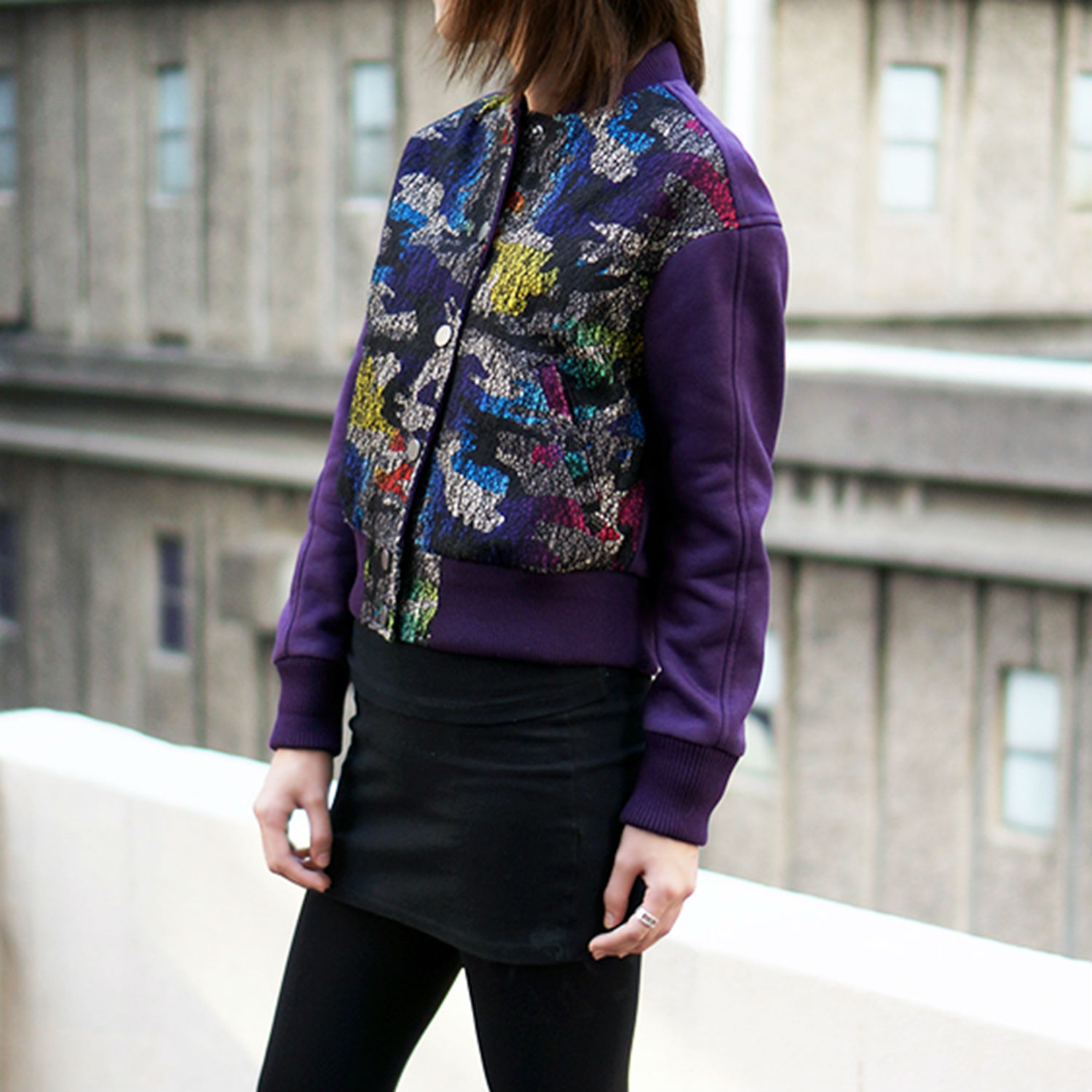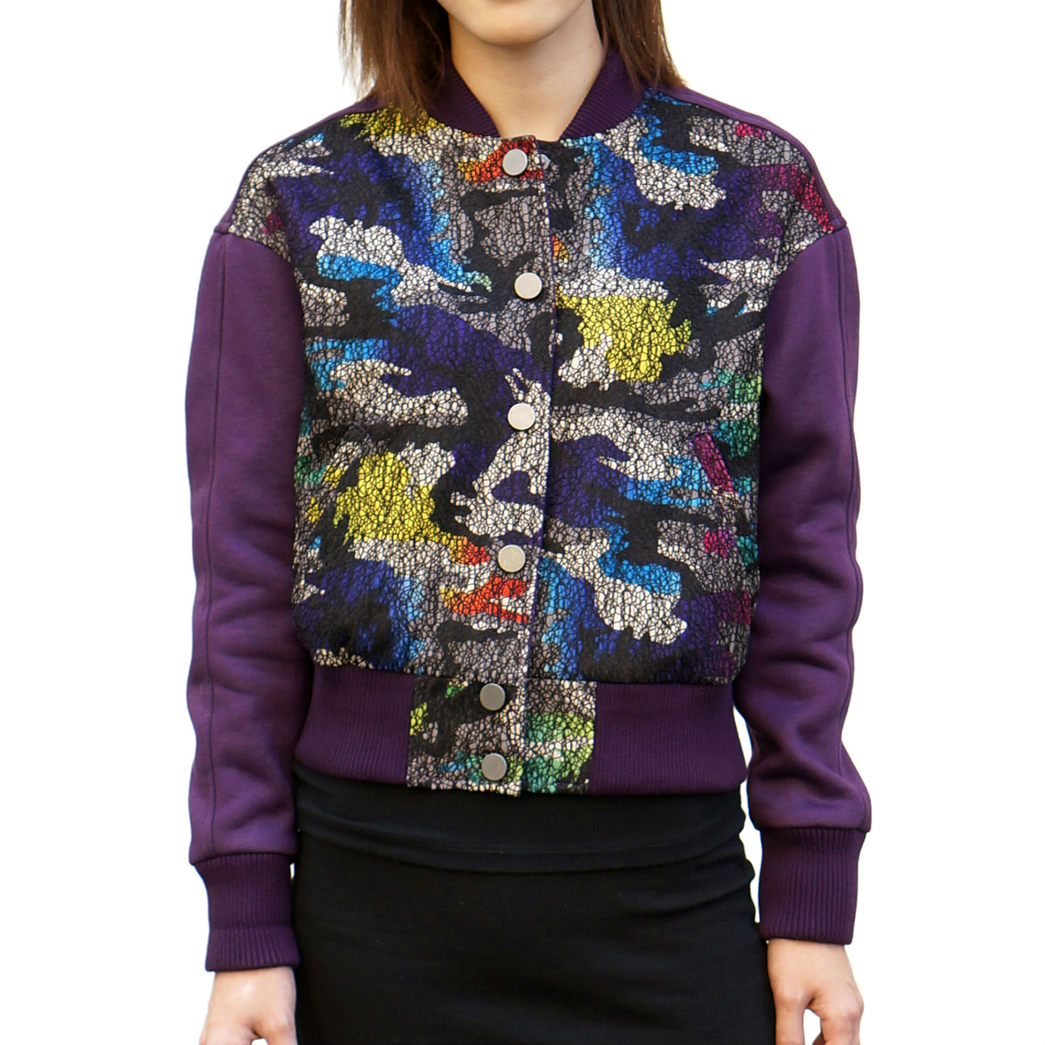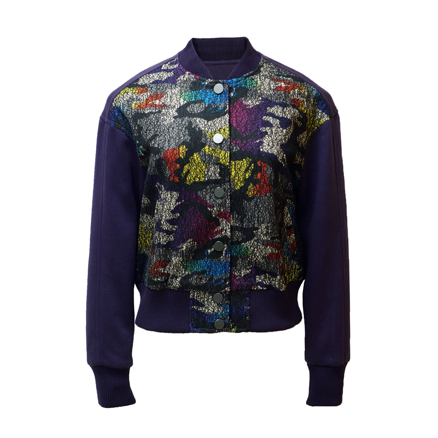 Long sleeve fleece bomber jacket in purple. Inside-out camouflage printing and mesh bonding at front. Press-stud closure and welt pockets at front. Ribbed knit collar, sleeve cuffs, and hem. Fully lined. Tonal stitching.