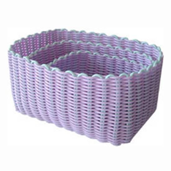 This is a set of three rectangular baskets for household use. They are light purple and light blue in colour and are available in three sizes. The baskets can be used for storing different sundry items, such as books, clothing and bags.