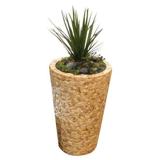 This is a tapered cylindrical water hyacinth basket. The exterior of the basket is patterned with embossed wooden grains. The irregular wooden grains create a natural look and feel. It is suitable for holding plants.