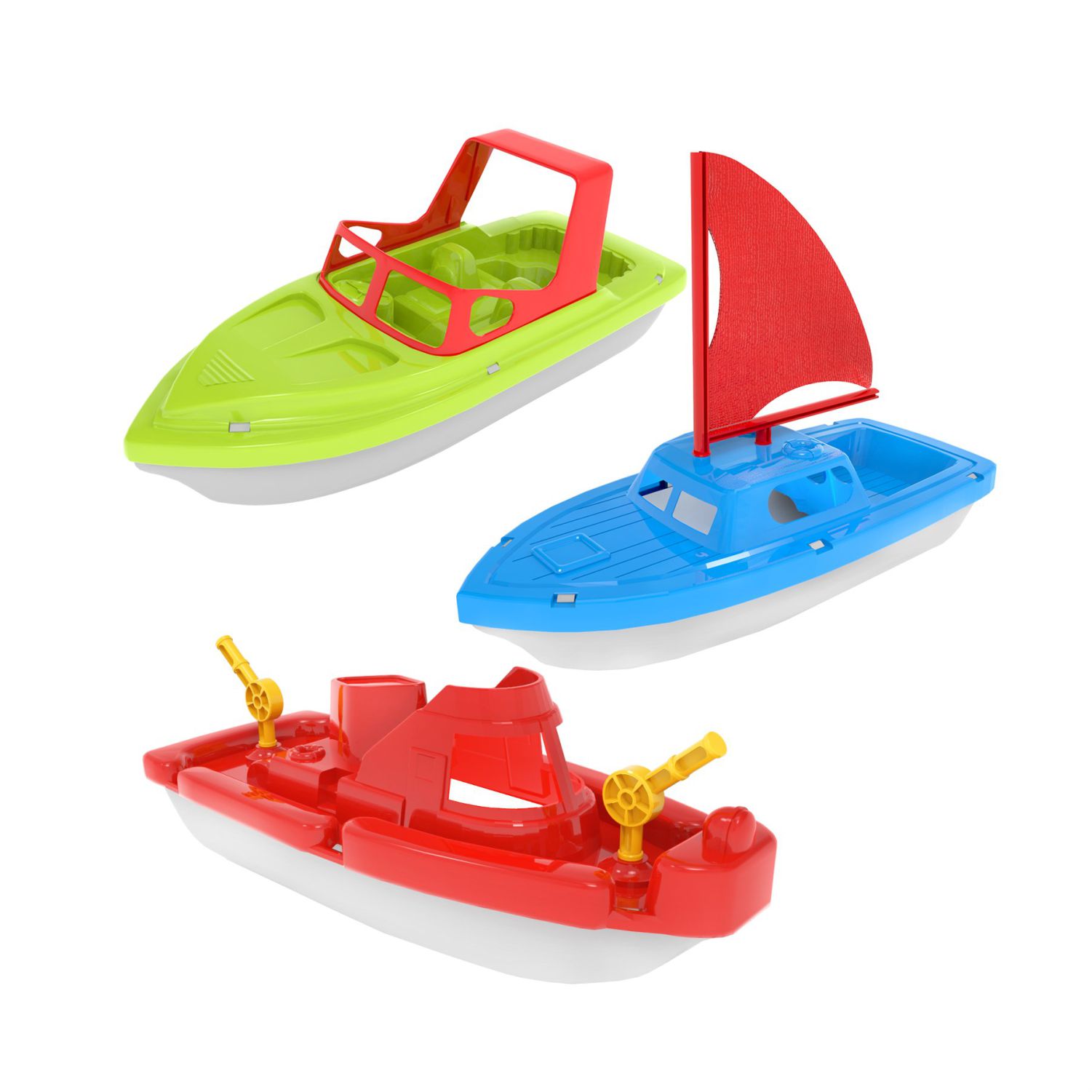 • Fill your tub with a variety of bath toys including blue sailboat, green speedboat and red fire boat.