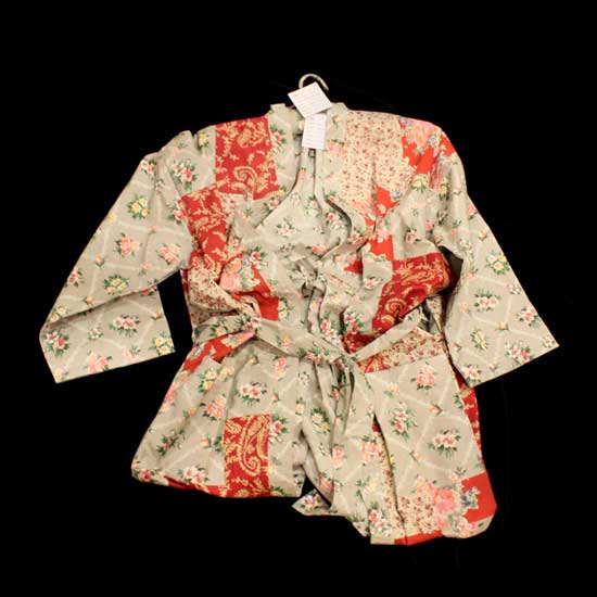Pictured is a fashionable bath coat accented with adorable floral patterns. The bath coat is made of high-quality cotton that ensures comfortable wearing. This beautiful bath coat is perfect for both bath or spa.
