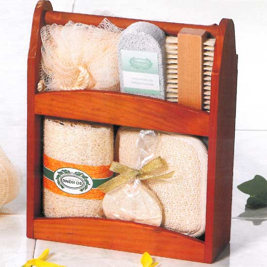 This deluxe spa gift set is a classic addition to your toiletries collection. It comes in a beautiful wooden case with a soft, polished finish. The set includes a soap bar, a towel, a brush, a bath sponge, and a bath puff.