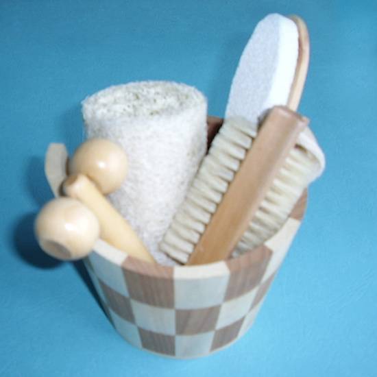 As shown is a bath set best for home or traveling use. The bath set includes a towel, massager, 2-sided bath brush and spongy brush in a small tub. Made of quality wood, this bath set is known for its durability.