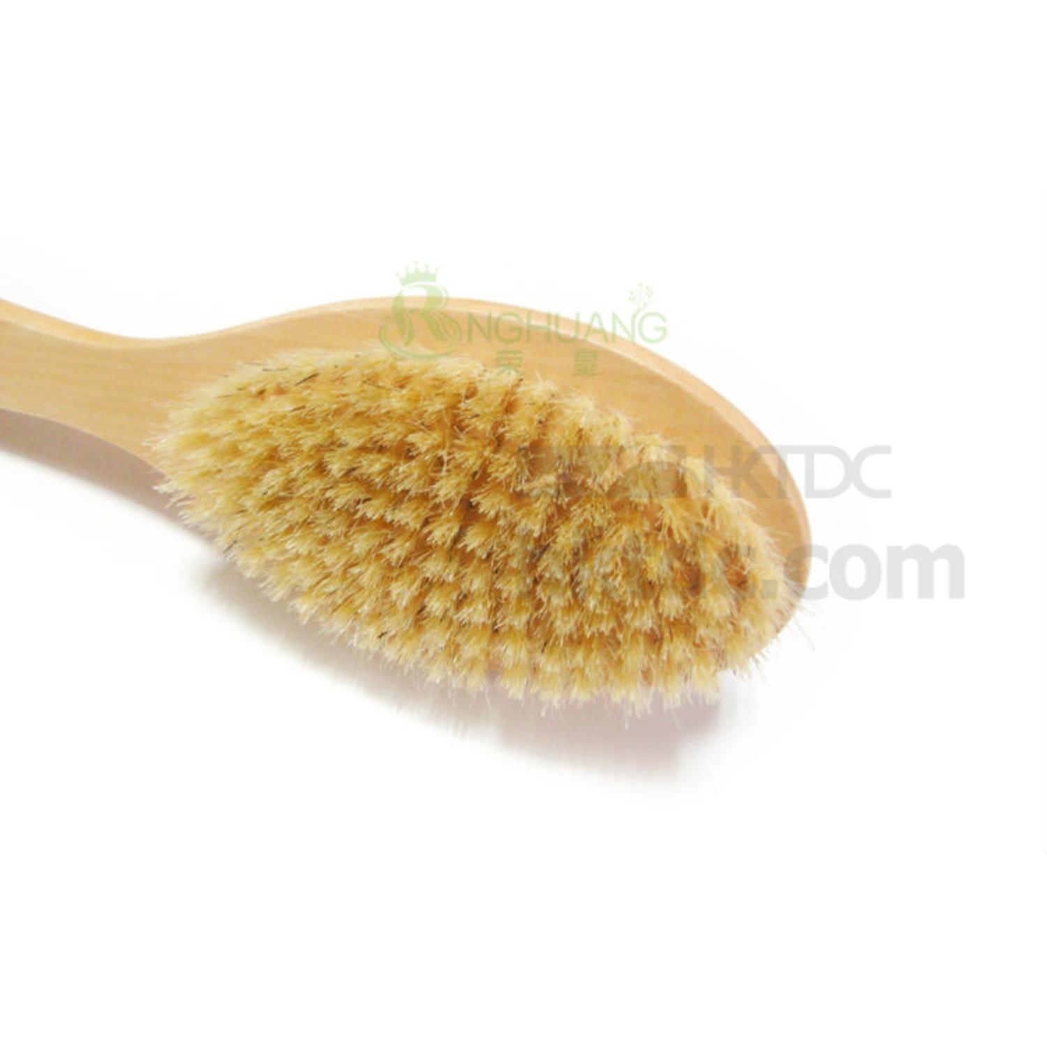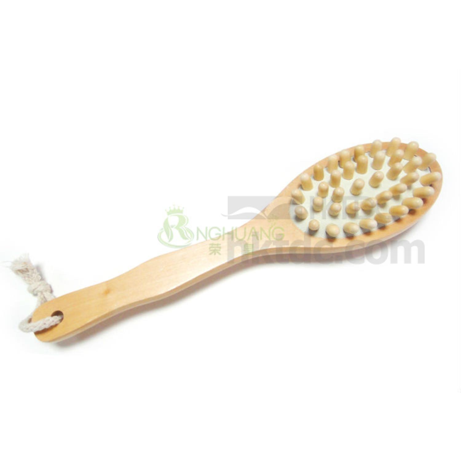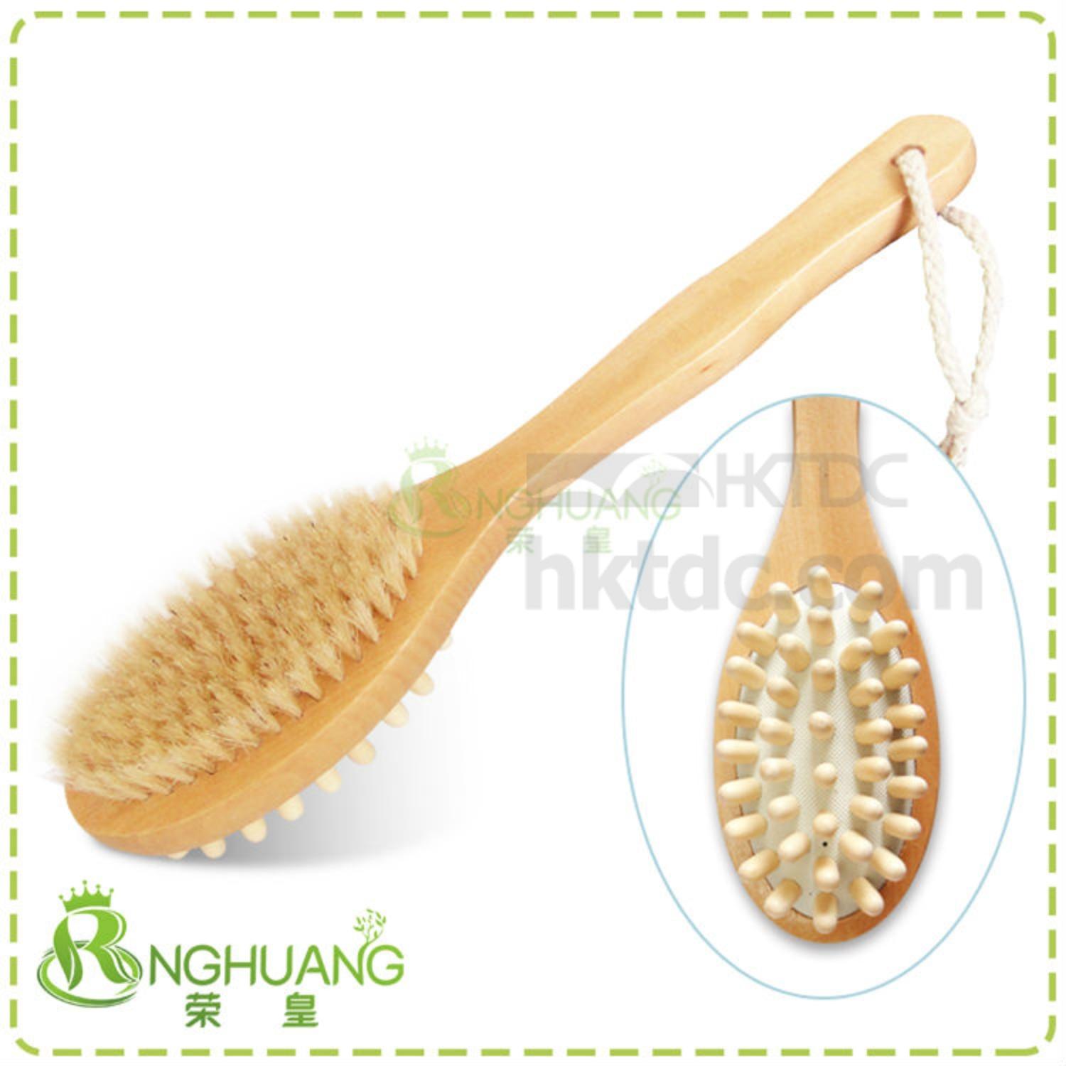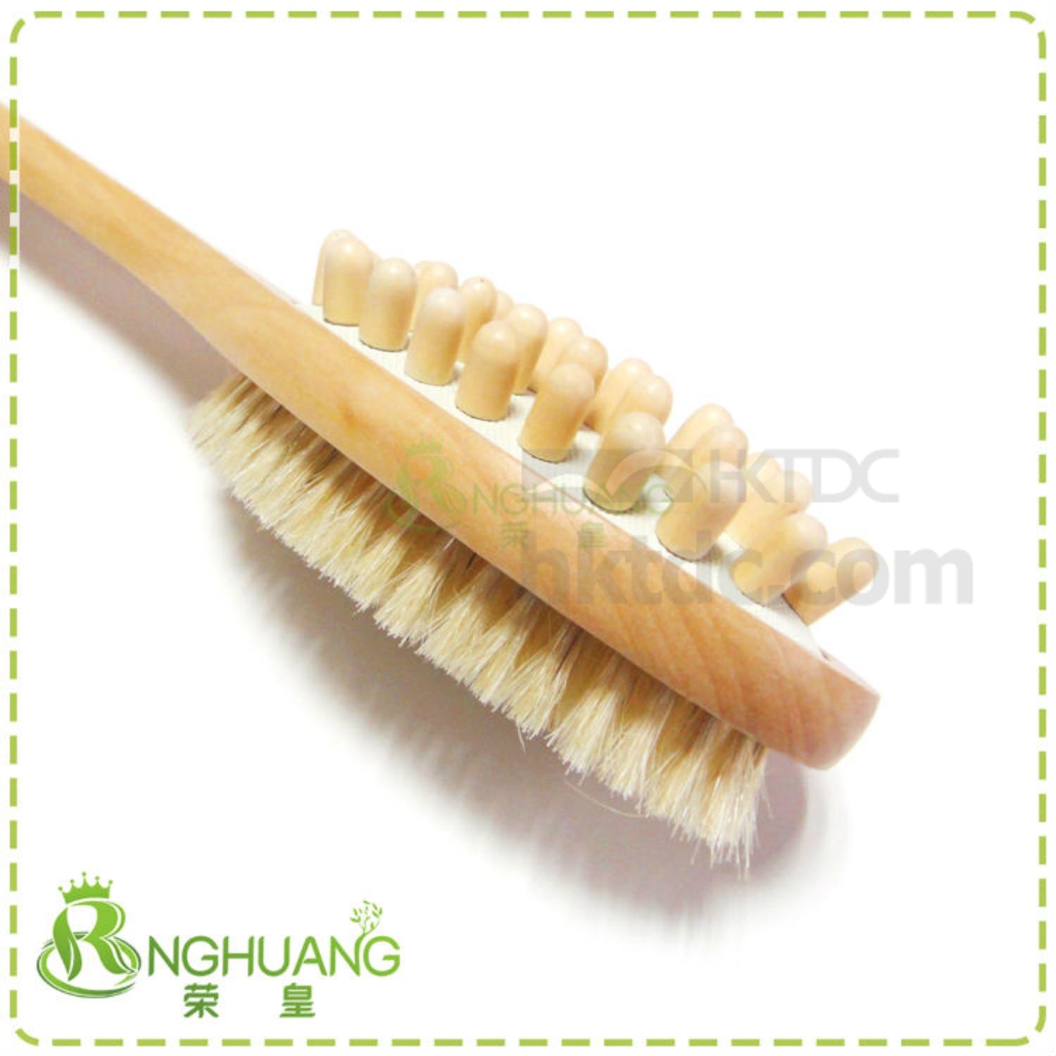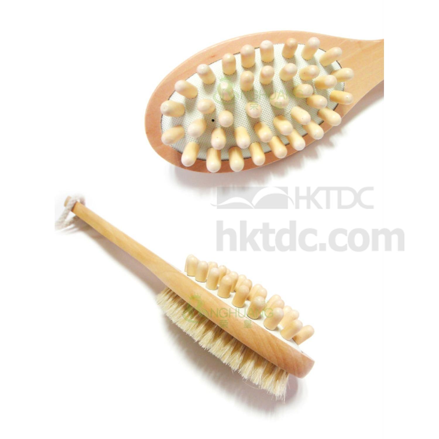 This brush is a versatile long handled (12.5inches) shower brush with a durable and detachable head and soft and natural bristles that clean and exfoliate the skin well. Even though tall, this brush is light and very easy to maneuver. Its gripped handle minimizes the risk of slipping while its well-finished design and rounded bristles clean, exfoliate, and fade cellulite well without scratching or irritating the skin. You will enjoy using one. Buy an original to get a 100% Bath Blossom limited guarantee.On the other side,there are wooden massager beads.Relaxing your body while shower.