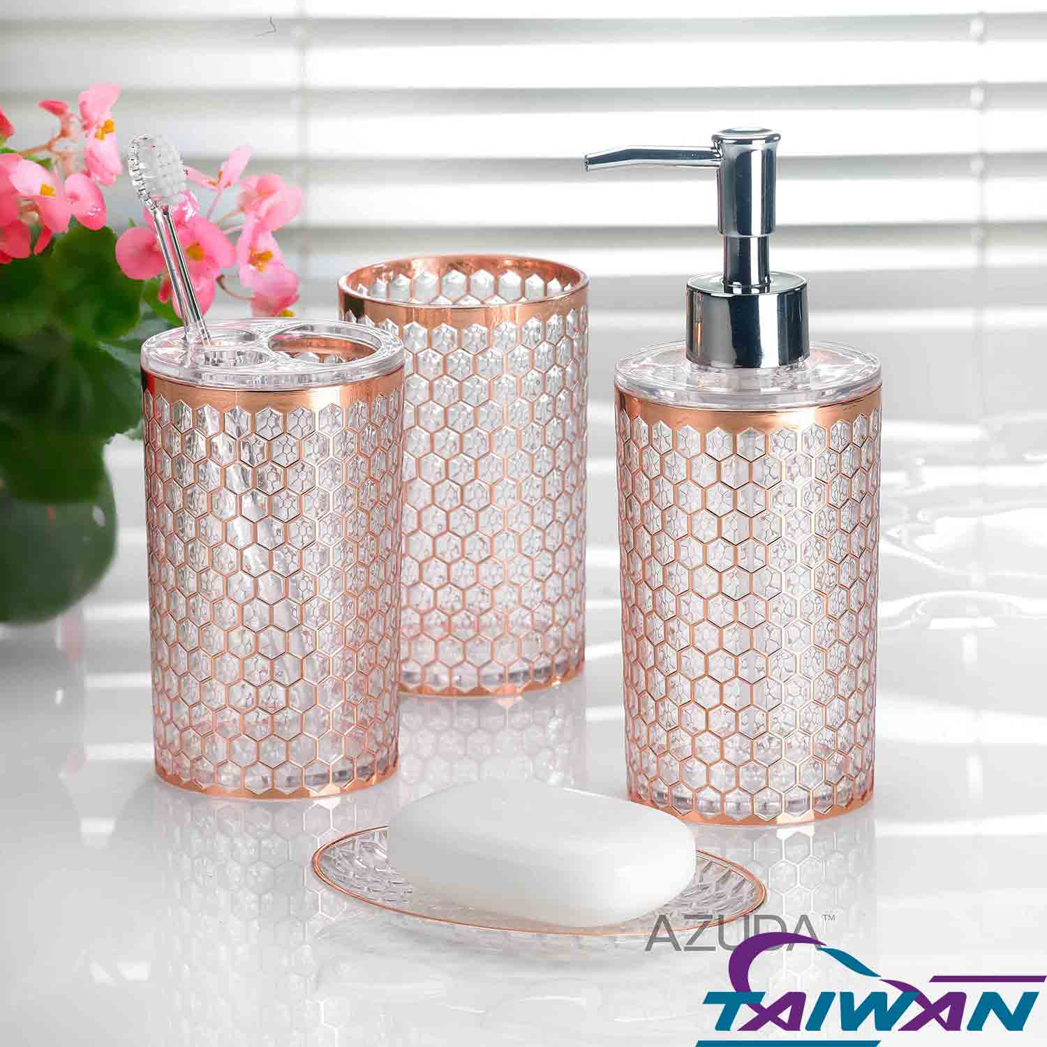 Something would look off in your newly revamped, two-toned master bathroom with the classic marble countertop and dazzling chandelier if you have random bottles and tumblers in different colors and sizes lying around the countertop. This is when this feminine and refined bathroom accessories set comes in. This set includes a lotion dispenser, a toothbrush holder, a soap dish, and a tumbler all in a similar design for a unified and put-together look. Each of the pieces comes in a transparent design enwrapped with a sheeny metallic copper exterior with delicate honeycomb cut-outs for a luxurious and graceful look that complements your finely designed bathroom. Transfer your hand lotion into the dispenser and store all your bathroom accessories in the presented set to complete your elegant and dreamy bathroom set up.