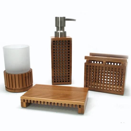This classic bathroom accessory set boasts a naturalistic charm with its bamboo construction and subtle polished finish. The set includes a soap dispenser, a water cup, a soap bar holder, and a toiletry holder. Add a sense of earthy appeal to your bathroom with this deluxe bath accessory set.