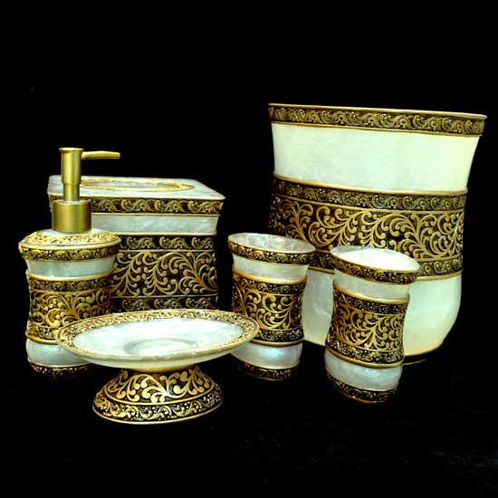 Update any bathroom decor with the featured bathroom accessory set. It comes with two tumblers, a garbage bin, a soap plate, a tissue case and a lotion dispenser. The set features a gorgeous hand-painted design.