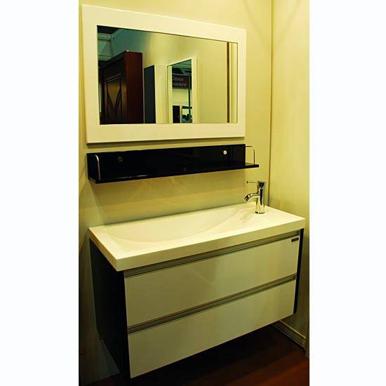 The bathroom cabinet with a basin and mirror boasts a simple shape, showcasing a sense of aesthetics. The contrasting black and white colors create a modern style. The marble basin has a rigid construction, making it perfect for long-time bathroom application.