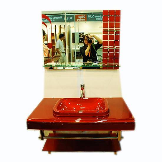 Designed in a classy taste, this is a supreme modern toilet cabinet with basin and mirror. The square-shape mirror decorated with mosaic tile and the sharp red basin look great together. The cabinet will add pleasure to your bathing time.