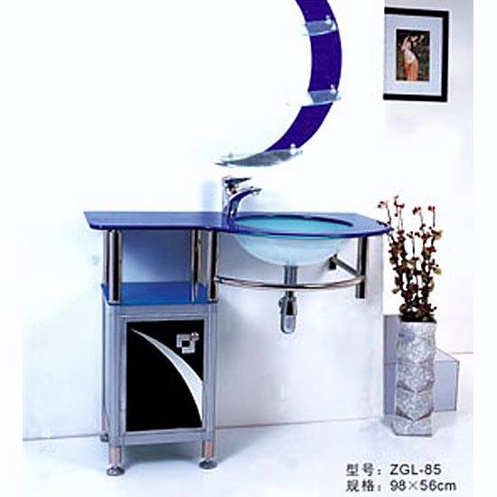 This bathroom cabinet is formed by an individual mirror and a basin attached to a cabinet. The mirror is in a beautiful oval shape, while the basin and cabinet are made of blue glass and stainless steel. This cabinet can easily match different interior designs.