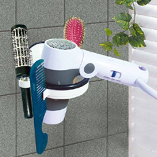 This bathroom rack is designed with a large ring in the centre for holding a hair dryer. As well as having smaller pieces for holding smaller items such as combs. Suction cup design for mounting on the bathroom walls. No tools needed for installation.