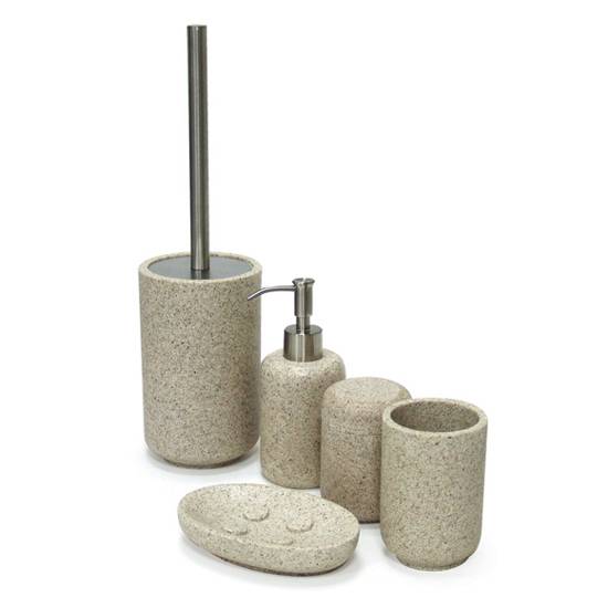 This is a bathroom series made of polyresin. It comes with a toothbrush holder, a shampoo pump, a tumbler and a soap dish. It is in sandy design which gives a sense of simplicity.