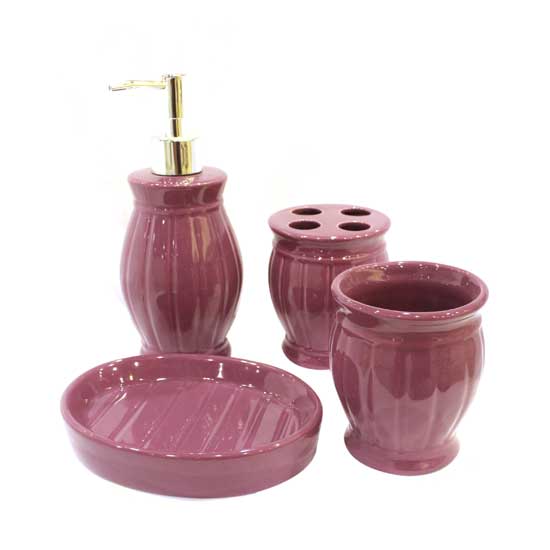 This alluring ceramic bathroom set is comprised of a liquid soap dispenser, a toothbrush holder, a soap dish and a tumbler. Each item comes with a glossy purple appearance with grooves. This chic bathroom set showcases your noble taste easily.