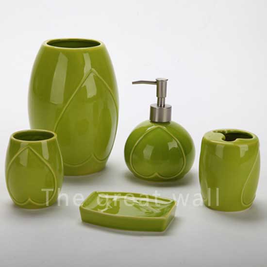 This is a bathroom set that comes with 5 pieces. Each piece is designed in allover green with a heart-shaped pattern. The high-quality porcelain material makes it stand out from the rest.