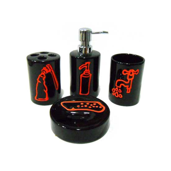 This is a stylish bathroom set with a lotion bottle, a toothbrush holder, a tumbler and a soap saucer. It is made of quality ceramic for durability. This black bathroom set comes with red patterns for an eye-catching look.