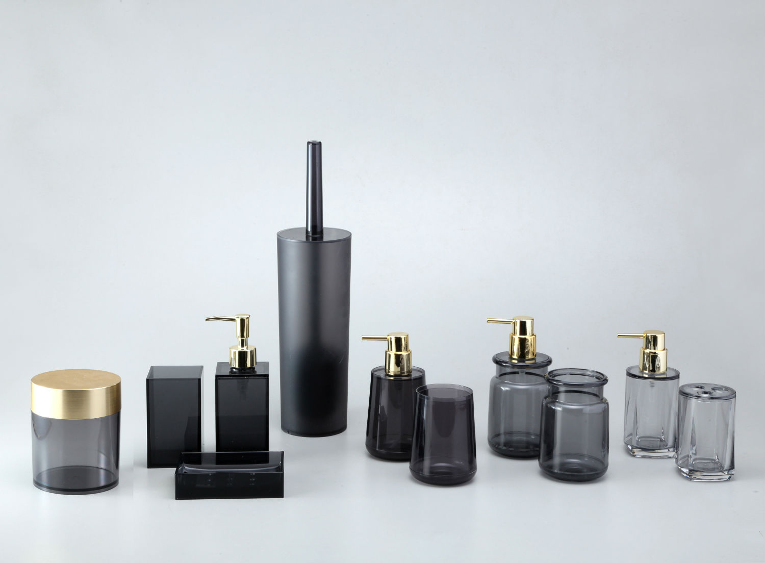 • Plastic bathroom accessories: toilet brush, soap dispenser, toothbrush holder and tumbler