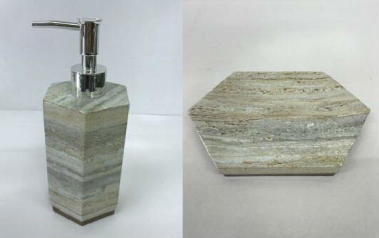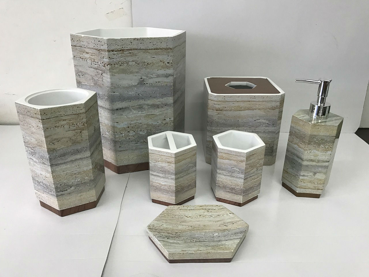 • The bathroom accessory set includes toothbrush holder, lotion dispenser, soap dish,cup, tissue holder,toilet brush holder, trash can.