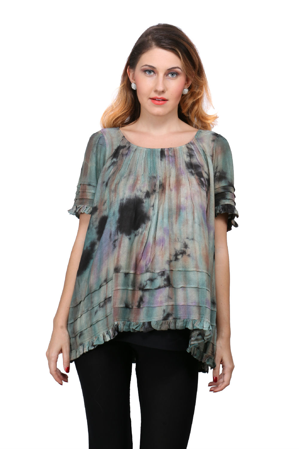 Batik Hand Dyed Tucked Top is a unique cotton gauze ensemble reaffirms your feminine grace and complements your inner spunk. We've given it frilly and flirty sleeves and hems, an unassuming neckline and a relaxed fit to render it suitable for both the petite as well as the full figured. Score high on style by slipping into a pair of rugged denims and cute pumps. This one's a great choice for those who like to keep it trendy.
