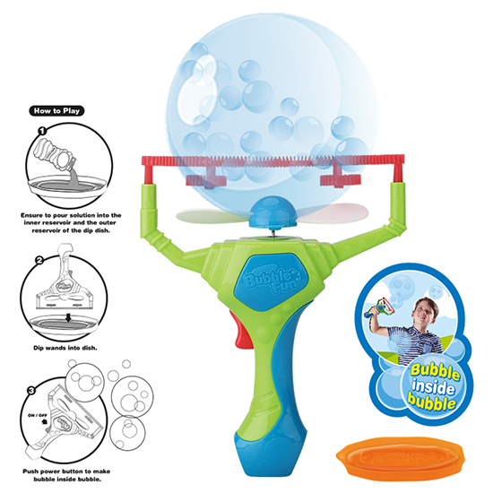 Function: Pour the bubble solution into dipping dish; dip the bubble wand into bubble liquid & raise it up, switch on, and see the air filled with amazing bubbles inside bubbles.