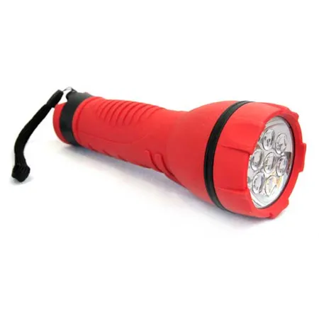 As shown here is a sturdy torch that provides reliable brightness in the dark. Equipped with 7 LEDs, this battery-operated torch flaunts powerful illumination. With a water resistant feature, this red flashlight can serve in all-weather conditions.