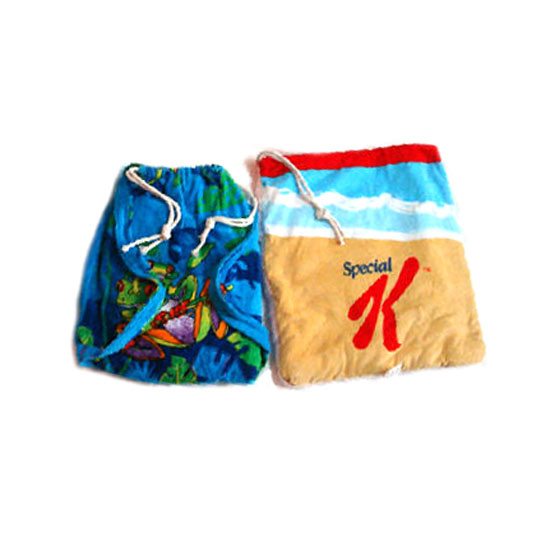 This beach bag comes with a colorfully printed surface. The cotton bag uses a pullstring closure. It is finely manufactured for a long service life.