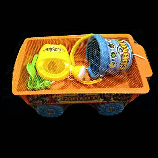 Featured here is a beach toy set with a cartoon theme. This toy set includes a bucket, a watering pot, a carrier and a set of shovels. It is the perfect item to enhance the fun in the summer time.