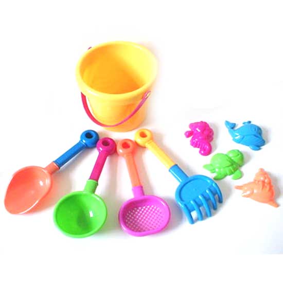 Displayed here is a beach toy set in vibrant colors. It is made of plastic for enhanced durability. This beach toy set includes everything needed to build a sand castle.