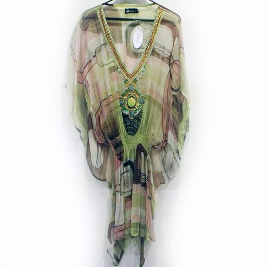 This sheer dress features flutter sleeves down the sides, leaving the cuffs flowing gracefully. The look is balanced out by a smocked waistline which shows your body curvatures. The delicate V-neckline is hand-beaded for glamorous accents.