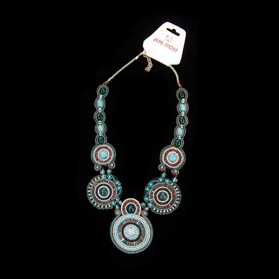 This fashionable necklace is crafted from glass beads in blue, brown and other colors. It is highlighted with circle details at the front, exuding effortless beauty. This handmade necklace is a wonderful accessory for ladies.