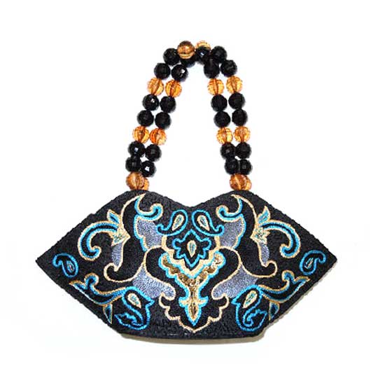 This is an evening bag that stands out from the rest with its unique and charming look. It features a lip-shaped body in deep black which is meticulously crafted with stunning and classic patterns in metallic colors. The beaded handles complete this handbag for a more-distinctive finish.