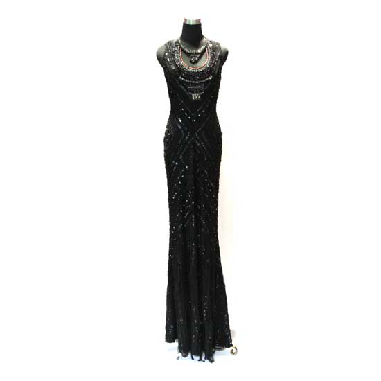 This strapless evening dress is fully covered in beads and stone embellishments. The fitted construction flatters and highlights the female body. This extravagant gown successfully draws onlookers' attention in any event.