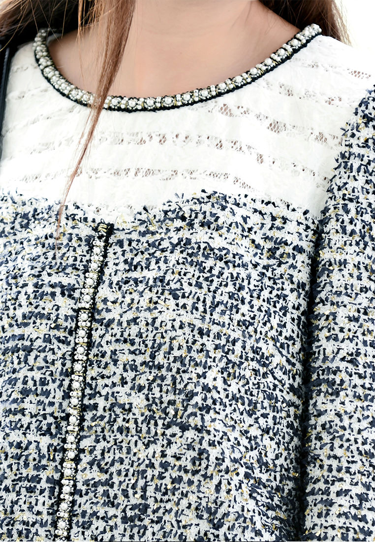 Crafted this beading top with textured bouclé, interwoven with Lurex, for giving a hint of metallic shine. And combined lace fabric at the front and back yokes will imbue a romantic touch to your professional sets with a lady-like grace. Besides being an ideal complement to office-ready tweed skirts, this piece will also look charming with shorts for smart casual wear.
