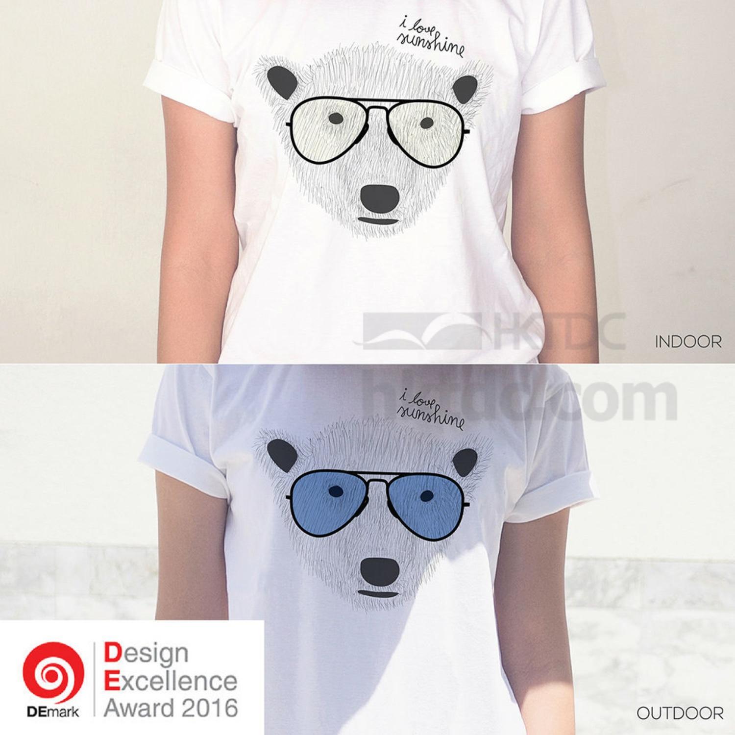 We design the t-shirt's patterns that mimic human behavior such as wearing sunglasses when they see the sunlight. The eyeglasses of the bear will turn to sunglasses when wearer go outside and exposed the sunlight.