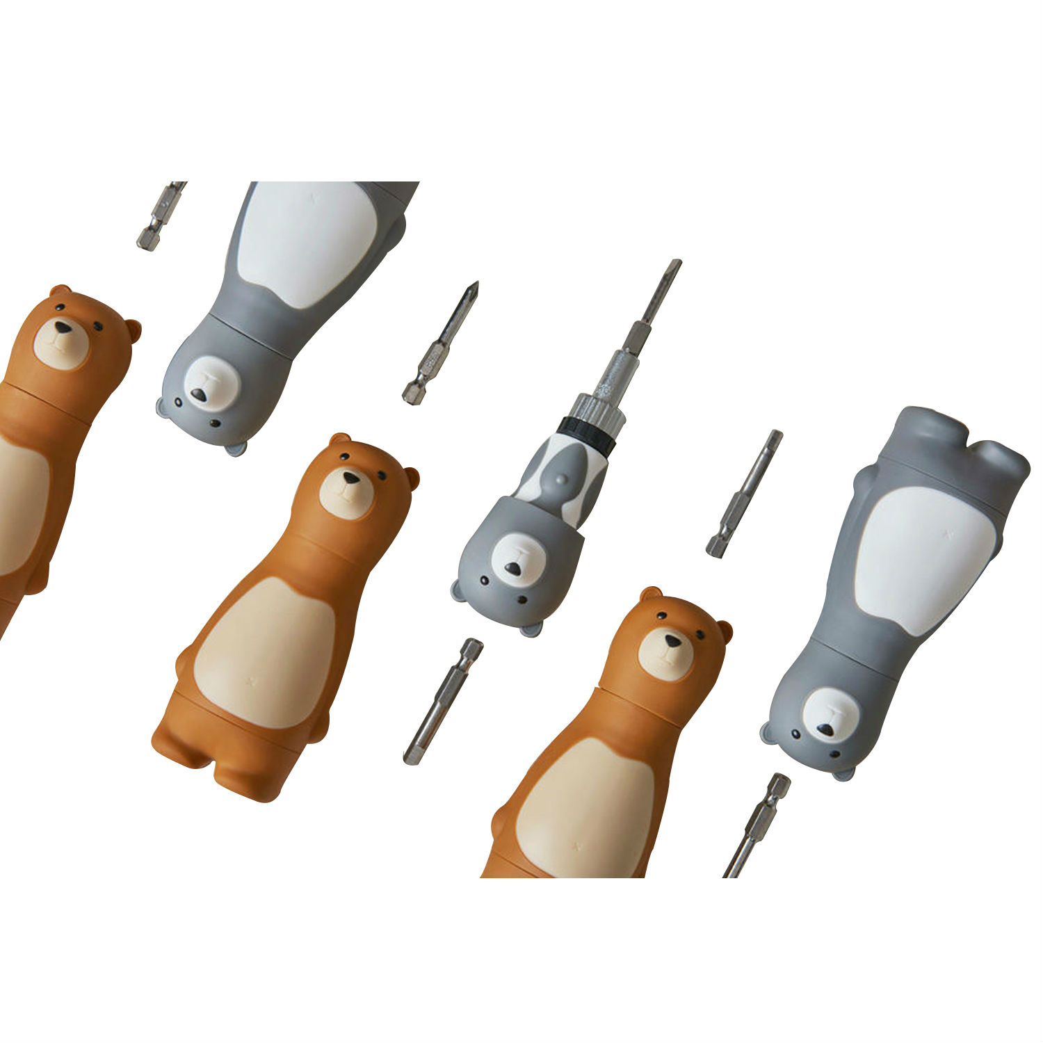 Bear papa ratchet screwdriver is settled with a magnetic bits holder of the head. Its torso can be removed from the feet which contain six different bits of most common sizes. The white “V” on the chest of the black bear represents Taiwan Black Bear which is the most significant and rare animal of Taiwan. We’d love to share Taiwan Black Bear with the world with Bear papa.