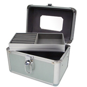 This beauty case features a PVC surface adorned with a light green finish. It is equipped with a round 15mm aluminum profile, a buckle, and a chrome-plated plastic handle. The case interior, featuring a mirror at its upper lid and grey bush tricot lining, is an elegant repository for your cosmetics. There is also a tray with cushions for easy display of jewelry pieces.