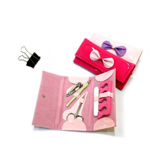 This is a 5-piece beauty tool set that features a stylish purse design with ribbon details. It has different manicure tools such as a nail clipper, a pair of scissors, etc. The stainless steel construction ensures an extra-long service life.