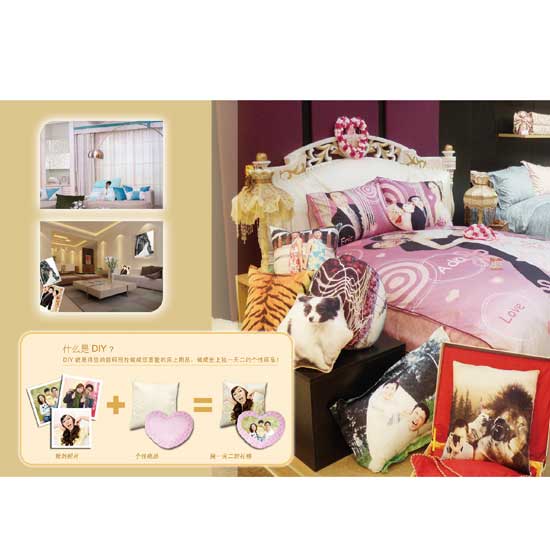 Displayed is a bed linen set in a customized design. The items like pillow covers, quilt covers and cushion covers can be printed with pictures and various graphics at customers' request. Simply added a warm touch to your bedroom with your unique bed linen items.